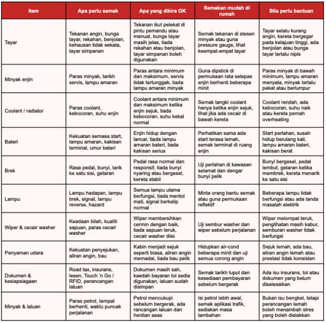 Panduan ini merangkumi apa yang perlu diperiksa, apa yang dikira masih okay, apa yang patut disimpan dalam kereta, dan bila anda patut dapatkan bantuan profesional sebelum pulang untuk Raya.