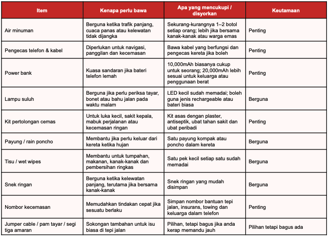Perjalanan yang lancar bukan hanya bergantung pada keadaan kereta. Ia juga bergantung pada apa yang anda bawa bersama. Berikut ialah senarai praktikal barangan yang berguna untuk disimpan dalam kereta sebelum perjalanan Raya anda.